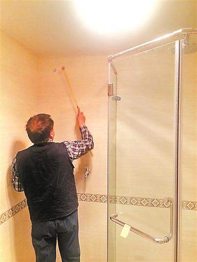 验房师在检验浴室瓷砖是否有空鼓现象