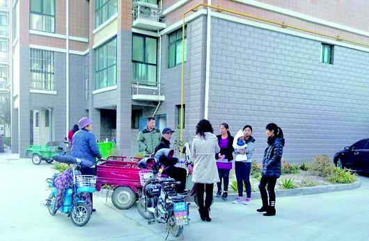 一些房屋面积“被增加”的业主聚集在楼下等待物业答复。 本报记者 张飒特 摄