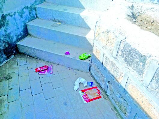 迷宫内部台阶处散落的垃圾。 本报见习记者 刘慧 摄