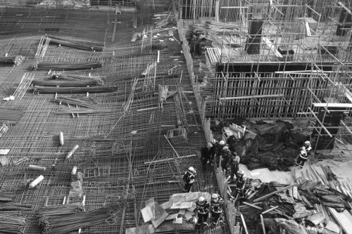 这位工人当时在附近施工,因距离事发底板有一段距离,所以逃过一劫。他称,事发底板整个面积大约30米宽50米长,由钢筋绑扎而成,整体靠脚手架支撑呈半悬空状态,悬空高度约1.5米。事发时,底板上方和下方各有几十名工人作业,突然下滑的底板,整体侧滑,将地面的人全部压埋。直至消防人员赶到,用切割机等器械,将被埋人员救出,其中多人已经死亡或受伤。