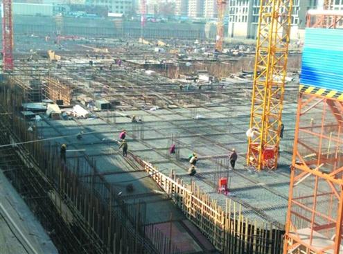穿过这些楼盘就进入北广场工地,工地周围都已设置围挡,从缝隙中观察,地下施工正在进行,工地中央深约15米的深坑中,几十个工人正紧张忙碌着。据现场工程人员介绍,地下工程从2014年9月25日开始施工,地下工程共三层,一层计划作为商业街,将来与北侧商业综合体项目相连,其余两层则作为停车场。此外,地下工程还为轨道交通预留了通道。