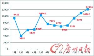 记者查阅2014年1~12月楼市数据获悉,去年共有3个月商品房备案成交突破万套,分别为5月10342套、11月10962套、12月12116套,其中12月成交量创全年新高。另外,1月、10月商品房成交超过9000套。