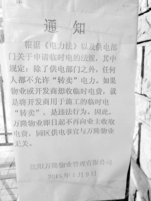 “铁西假日蓝湾小区已拖欠2014年11月份、12月份电费至今未缴纳,经多次沟通,至今仍未缴纳电费,决定于2015年1月15日上午10时起,将对欠费小区采取停电措施,带来不便请广大居民给予谅解。”在铁西区假日蓝湾小区物业办公室的大门外,一纸告示引来小区居民议论纷纷,有居民拨打沈阳晚报新闻热线96009求助,“停电是真的吗?大冷天说停电就停电,凭啥让咱居民遭这罪?”