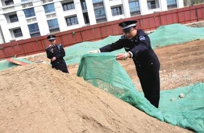昨天,石景山古城西路附近的一处房地产项目工地,城管队员苫盖裸露的工地。该工地因施工扬尘等问题,被市城管局立案调查,面临高限处罚。据市城管局透露,今年将利用建筑垃圾运输车信息平台对运输车辆全程监控,所有城管分队也将通过工地远程监控平台对工地施工扬尘问题进行监控。