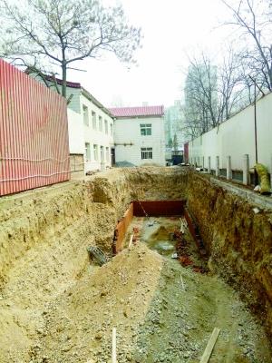 记者从两块围挡中间的缝隙钻进去后,一个大坑映入了记者的眼帘。大坑长度大约30米,宽不到10米,深度大概在7米左右。坑的东侧底部浇灌了一层混凝土,在混凝土层上已经砌起三面一人多高的砖墙。大坑西侧及坑口堆放着成堆的沙子,坑里还能看到木材、钢窗、钢筋等建筑施工材料。