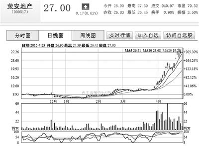 从3月27日到4月23日,短短18个交易日,荣安地产(000517,SZ)在利润下滑97%的背景下,其股价竟从10.75元的开盘价一路上行,直到27元,其涨幅高达151.16%,对于一个没有任何题材的地方区域性地产股,其如此涨势确实令人诧异。在荣安地产股价疯狂的背后,《经济参考报》记者获得信息显示,荣安地产实际控制人涉嫌为配合大股东减持,出资联手庄家炒作自家股票。