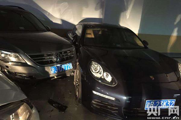 地库湿滑多辆汽车相撞(央广网记者管昕 摄)