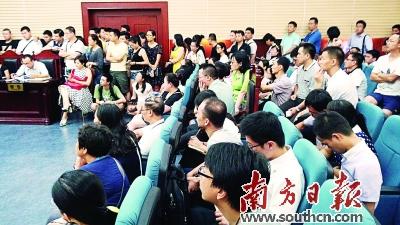 15日下午2时,宝安法院三楼14庭被前来听庭审的市民围得水泄不通。庭内的60个座位被提前到的市民抢占一空,而后边来的市民只能站在法庭两侧以及后侧。记者现场粗略估计,前来听庭的市民在150人左右。