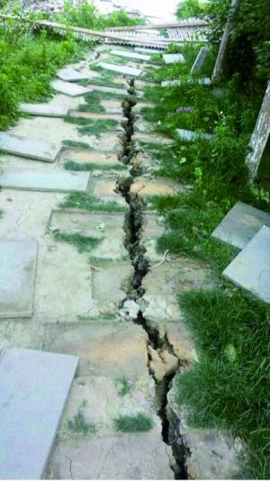 记者现场测量了一下,5号楼的地基部分与地面之间裂开的距离大约有20厘米左右,裂缝深达2米左右,而楼边的一条便道,同样也开了一个大口,深达一两米。除此之外,业主们还告诉记者,自从地下人防工程开挖后,5号楼所有业主室内的北侧墙体都出现了不同程度的裂缝。
