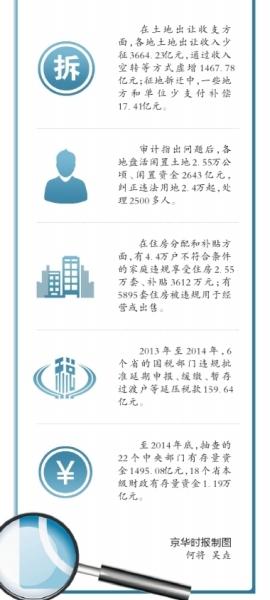 受国务院委托,审计署审计长刘家义昨天向十二届全国人大常委会第十五次会议作了关于2014年度中央预算执行和其他财政收支的审计工作报告。报告首次披露了土地审计及财政存量资金审计情况。
