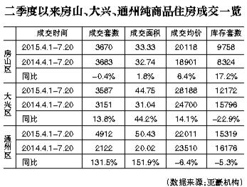 据亚豪机构统计,今年二季度以来,纯商品住房(包括商住,不包括自住房,下同)库存出现了明显的变化。截至7月20日,大兴区库存套数为12172套,与去年同期的15796套相比,降速达到22.9%;通州区的库存为15319套,较之于去年二季度同期16176套,去化速度也达到5.3%。