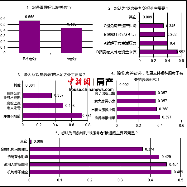 在“目前制约以房养老推进的主要因素是什么”这一问题上,中新网房产频道调查结果显示,30.9%的网友认为是受我国传统观念的制约,27%的网友归因于金融机构业务条款、配套机制等不健全,21.9%的网友认为是政策适用人群范围窄。数字100市场研究公司的结果则显示,选择上述三项的网友占比分别为42.9%、46.9%和45.4%。(中新网房产频道)