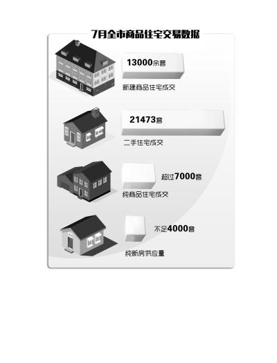 根据链家市场研究部统计,7月全月新建商品住宅(含保障房、自住房)网签量为13324套,比6月上涨42%。扣除保障房、自住房后,纯商品住宅成交7440套,环比上涨15.9%,同比上涨164.5%,创下2013年10月以来新高。