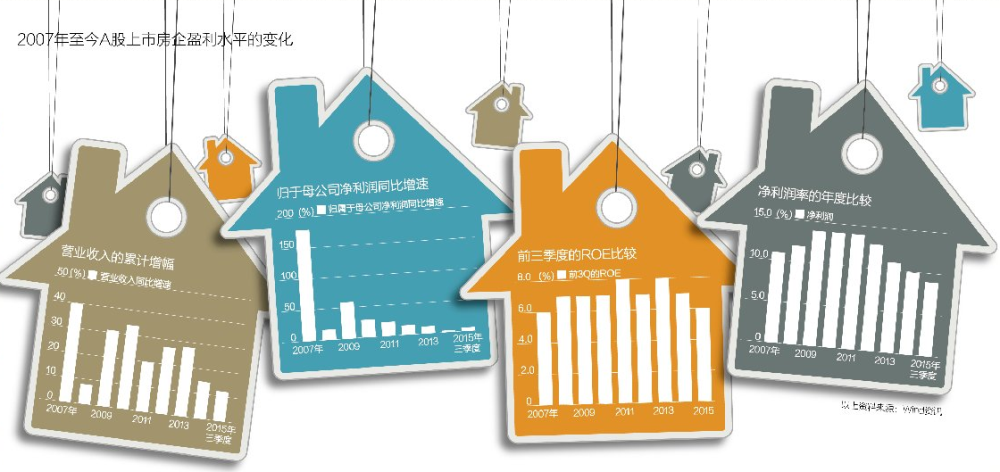 该报告数据还显示,2014年和2015年前三季度,A股房地产板块的毛利率稳定在32%左右,虽然比2011年高峰期有所下降,但还算稳定。另一方面,房地产板块前三季度的ROE水平降为6.1%、净利润率水平降为9.4%,均是2007年以来的最低点,比去年同期下降明显。