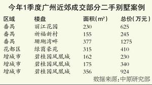 搜房网广州二手房电商商圈经理梁梦静介绍,别墅在整个二手房交易市场中处于较高端的位置:“受到3月整体楼市成交上涨的带动,一向较为‘理性’的别墅市场也有所变化。”她发现,以番禺最受关注的别墅区华南碧桂园为例,去年年底其独栋别墅的均价多在2.5万元/m2左右,部分急于出售的业主甚至愿意降到2万元以下,但最终也难以成交。在经过了3月份的楼市之后,这些别墅已普遍涨至2.8万~3万元/平方米之间。