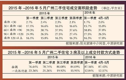 中原研究部监测的阳光家缘数据显示,120平方米的物业在2016年4月~5月份成交占比较第一季度提升了1.5个百分点,对于打算生二孩的老百姓来说,一方面,人口增多,需要提前购置大房;另一方面,在低利率的时代,买房不仅可以使资产保值增值,对抗通胀,也能利用低利率政策减少购房成本支出。在2016年成交的3房及以上的物业付款方式来看,按揭贷款的占比呈一路走高的态势,2016年1月~5月份占比在87%的水平,较2015年第三季度多了7个百分点左右。