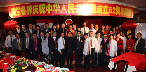 中新网9月16日电 欧洲当地时间9月13日晚,全荷各界华侨华人与旅荷学者、留学生、中资企业及中国驻荷使馆工作人员500多人一起在荷兰鹿特丹海上乐园举行庆祝祖国母亲62岁华诞生日晚会活动,中国驻荷兰大使张军、政务参赞张晋雄、领事黄瑛、国侨办秘书郑皓、鹿特丹市政府代表俊.维伯克等分别出席联欢活动。