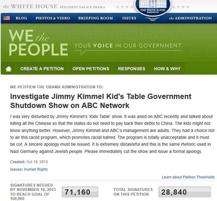 在白宫网页上,要求删除该节目的白宫请愿书已有超过2.8万个签名。请愿书称对这场“儿童圆桌秀”深感不安,“这个节目是完全不可接受的,它应该被禁止播出。纳粹德国对犹太人使用过相同的言辞。相关方必须立即删剪这档节目,并诚挚道歉。”