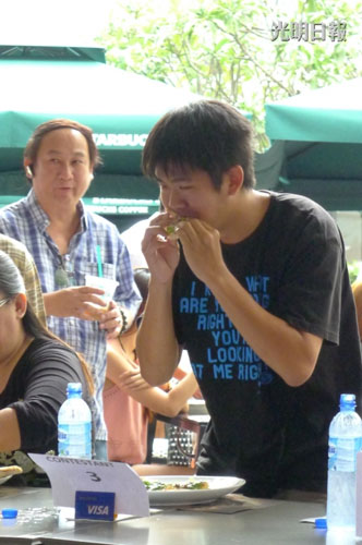 陈徐维佃是新加坡食物挑战俱乐部的成员,经常到处寻找这类比赛,挑战自己。他以17分钟8秒完成挑战,成为首位赢家。前来挑战的不仅是男子,也有2名女子上前挑战,只差一点就成功。不过,赢了挑战,输了健康,医生建议人们少参加这类挑战。