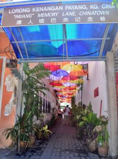 唐人坡巴央纪念巷挂上色彩缤纷的雨伞,形成独特的景观。(图:星洲日报)