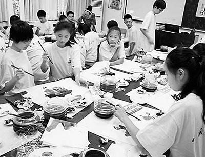 图为丽水华人华侨子女夏令营的营员们跟老师学习国画。