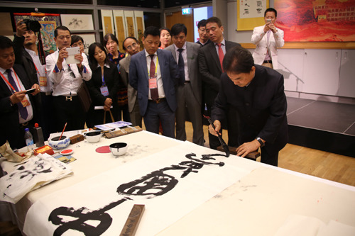 中新网8月21日电 据《欧洲时报》报道,8月16日下午,为庆祝第18届欧洲华人华侨社团联合会(欧华联会)大会召开,由中国长城书画协会、欧华联会主办的《欧华中国梦》中国书画展,在瑞典首都斯德哥尔摩大会会场举行。画展展出近百幅中国书画名家的作品。