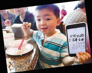 “我是文明小游客,文明出游,自觉排队!”“我是文明小游客,我不浪费粮食。”最近,网友张芊在天使妈妈网发出4岁儿子胡桐去泰国旅游时的一组照片,得到了不少人的赞许。在这些照片上,胡桐或举着手机、或拿着平板电脑,上面写着倡导文明出游的标语。张芊说,4岁的胡桐一路上拿着这些标语拍照,不仅改变了自己,也感染了身边的人。
