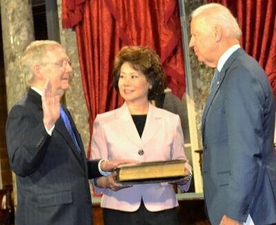 麦康奈尔(左)由副总统拜登(右)宣誓就任参院多数党领袖,中为妻子赵小兰。(美国《世界日报》/许惠敏 摄)