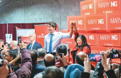 图为加拿大华裔伍凤仪(右)在当地时间4月3日,以51.3%的支持率当选为众议院议员,现任加拿大总理贾斯廷·特鲁多(中)表示祝贺。资料图片