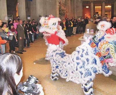 中新网2月9日电 据美国《世界日报》报道,纽约市大都会博物馆7日举行首次农历新年庆祝活动,长岛中华协会的三头醒狮在博物馆大厅内随着锣鼓起舞,长风少年中乐团和赵建荣分别表演了中国民乐和变脸绝活,芝麻街的演员们也与小朋友们讨论中国12生肖,不同族裔的民众一起体验中华传统文化,欢度春节。