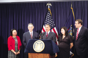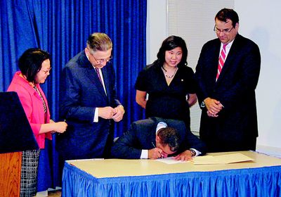 分别在州参、众两会提出该案的州参议员强森(Craig Johnson)和华裔州众议员孟昭文,以及州众议长萧华(Sheldon Silver)和州高等法院法官凌德丽,偕同数十位亚裔小区人士见证了这一历史性时刻。