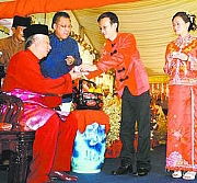 首相然后喝下茶,再交给一对新人各一封红包,仪式完成。华裔的婚礼仪式获得与会者的热烈掌声,顿时让婚宴热闹起来。
