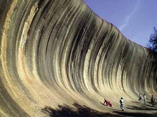 位于Hyden附近的波浪岩 (Waverock)是一大奇观,从远处看,平地上腾起一个个滔天巨浪,来势汹汹;心神未定,它又像一只河马张开大口嚎叫;走近一看,原来是一块倒立的巨型怪岩,颜色艳丽夺目,而且其色调会随着阳光而变化,令人叹为观止。如果人们站在波谷拍张照片,就像个逐浪而去的体育健儿。沿着斜坡登上波浪岩,那里又是另外一种景色,怪岩变成一片牧羊的农地,而且还建立了一个储水库以利农业。
