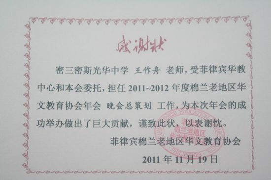 作为一名体育教师,他却积极向当地华文媒体投稿,在菲律宾《世界日报》上发表通讯稿三篇、散文一篇。在菲律宾布拉卡大学孔子学院和菲律宾华教中心共同举办的2011年菲律宾汉语教学与汉语推广学术研讨会征文比赛中,王作舟老师的论文《浅谈菲律宾华校隐性课程的开发》获得三等奖。他的付出也赢得了菲华界的充分肯定。