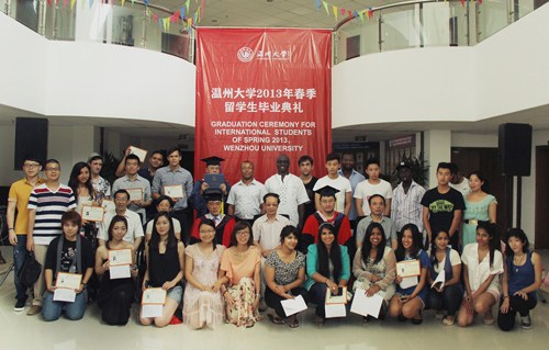 中新网7月5日电 据温州侨网消息,日前,国侨办华文教育基地——温州大学举行2013年春季留学生毕业典礼,温州大学副校长薛伟和温州大学人文学院副院长孙良好共同为该校培养的第一位外籍硕士研究生木村和幸拨穗,并颁发了硕士学位证书和毕业证书。同时,来自美国肯恩大学的7名亚洲研究项目交换生和来自加纳、不丹、南非等国的32名语言班留学生拿到了温州大学颁发的结业证书。