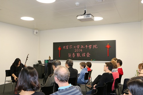 联谊会伊始,朱琦院长介绍了孔子学院2014年上半年将开展的工作,重点介绍了为学术团体安排的三场学术讲座,为社会群体准备的每月两次“中国沙龙”活动,大学生2周“体验中国”夏令营, HSK考试及教师培训等内容。周晓霞院长简单地介绍了中国春节传统, 即将成为巴塞尔大学孔院海外志愿者教师的向健美表演了二胡“赛马”,预祝大家马年吉祥如意。