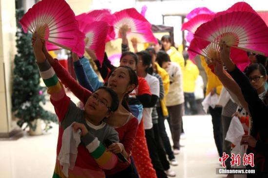 12月26日,在山东省青岛市,参加“海外华裔青少年中国寻根之旅舞蹈冬令营”的营员们在舞蹈老师的带领下学习山东大秧歌,从中国民间舞蹈开始寻根中国,了解中国。由国务院侨办主办的“海外华裔青少年中国寻根之旅舞蹈冬令营”共有来自印尼、马来西亚、新西兰的151位海外华裔青少年及领队老师,在20天的时间里,营员们将学习中国民间舞蹈和中国文化,游览青岛市容市貌。中新社发 徐崇德 摄