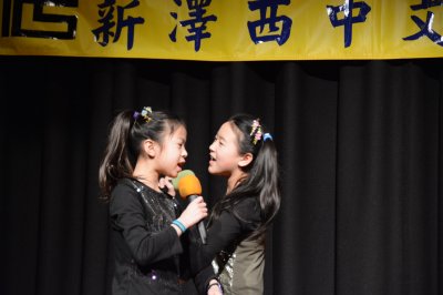 新州中文学校协会举办卡拉OK赛,高年级双人组第一名任乐怡、黄昱玮演唱《听你说》,精采投入。(美国《世界日报》/刘亮吟 摄)