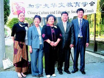 中新网9月22日电 据加拿大《世界日报》报道,由加拿大华文教育学会、约克大学中文部、中国驻多伦多总领事馆联合主办得“海外华文教学研讨会”本月20日在约克大学举行,邀请中国汉语专家学者共同探讨海外华文教学新模式。图为参加研讨会的加拿大华文教育学会会长任燕红(中)、中国华东师范大学教授张建民(右一)、为爱民顿孔子学院文化部主任谢绵绵(左一)等人合影。 (葛健生 摄)
