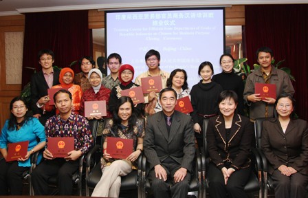 中新网1月7日电 据北京华文学院网站消息,近日,由中国商务部主办、北京华文学院承办的“2009年印度尼西亚贸易部官员商务汉语培训班”结业典礼在北京华文学院举行。