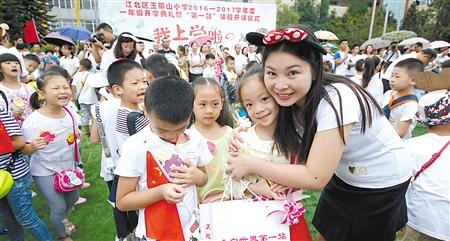 小学新生入学走红毯 老师戴卡通头饰欢迎