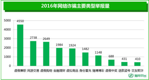 虚假兼职是2016年被举报数量最多的诈骗类型,一共出现4550例虚假兼职诈骗,占比22.1%;其次是网游交易、虚假购物、金融理财、虚拟商品和身份冒充。