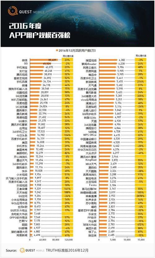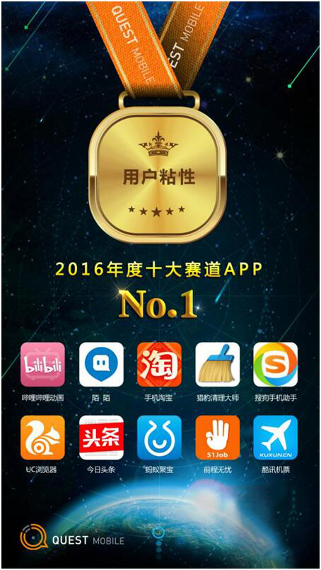 参与互动 1月12日,国内知名移动大数据服务商QuestMobile发布关于移动互联网的2016年度报告——“2016年度App价值榜”。报告显示,2016年12月,UC(原UC浏览器)活跃用户数同比增长8%;在用户黏性的“年度十大赛道APP”榜单上,UC和哔哩哔哩动画、陌陌、手机淘宝等分列各领域第一。