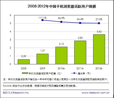 昨天,艾瑞咨询发布中国手机浏览器市场的调查研究数据显示,2009年中国手机浏览器用户规模达1.27亿,同比增长117.1%,预计今年手机浏览器活跃用户规模将达到2.12亿。