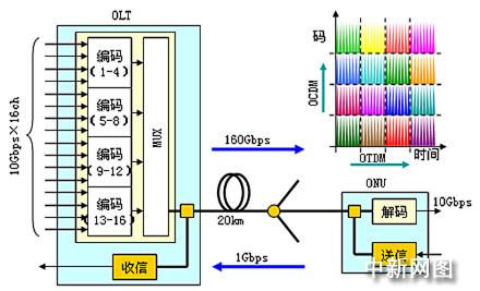 本系统中的主要装置OLT,将10Gbit/s(每秒10千兆位)的信号16码片(chip)各自进行编码后,以25ps的时隙(Time-Slot)进行光学复用,在波长上4倍化,输出10Gbps×16ch的复用信号。这一160Gbit/s的信号,以传输距离20km(光接入系统的最长传输距离)进行传输后,通过1×16的分路器(Splitter)进行分配后,再通过ONU以编码选择进行解码,抽取信号,成功复原了10 Gbit/s的信号。