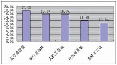 白皮书提出了一系列尖锐却又是显而易见的问题:当手机从原来的通话、短信,到现在成为听音乐、导航、上网、炒股等应用的工具,其电池容量却多年来徘徊在960毫安以内;为什么充电器、耳机等可以重复利用的配件不是可选配件?另外,随着手机应用的扩展,运行速度慢、稳定性差已成为网友最厌恶的第一大问题。