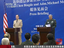 解放军总参谋长陈炳德上将11日上午与来访的美军参联会主席迈克尔•马伦海军上将举行会谈后,共同会见了中外记者。陈炳德指出……