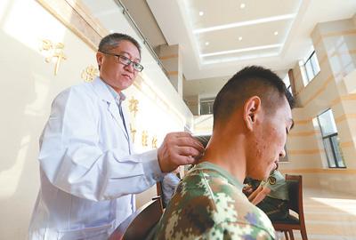 江苏省南京市中医院一名专家为南京港边检站监护二中队官兵进行针灸服务。贾子扬 雍冉冉摄影报道