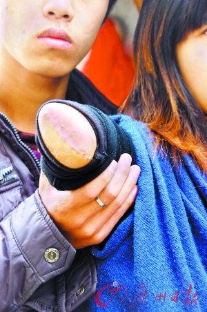 男友蔡晓斌(化名)小心翼翼地托着秋菊这段残留的“胳膊”,生怕捏疼了似的。这个19岁男孩的右手中指戴着的银色戒指显露在记者的面前。“就在出事前一个多月我买的,我和她各一个,是便宜货,不值钱的。”晓斌苦笑着说。