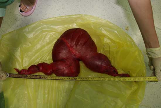 手术台上,久经“沙场”的肝胆外科主任医师秦锡虎也被眼前的景象吓了一跳——小伙子腹中被一巨大的透明囊管状物占据,重如一个足月的胎儿,最粗的地方周径达三十六公分,总长约五十五公分,其内充满积水,比正常人饱食后的胃还要大很多,像一截“巨蟒”堆在腹内,一头连肾脏,一头通膀胱。